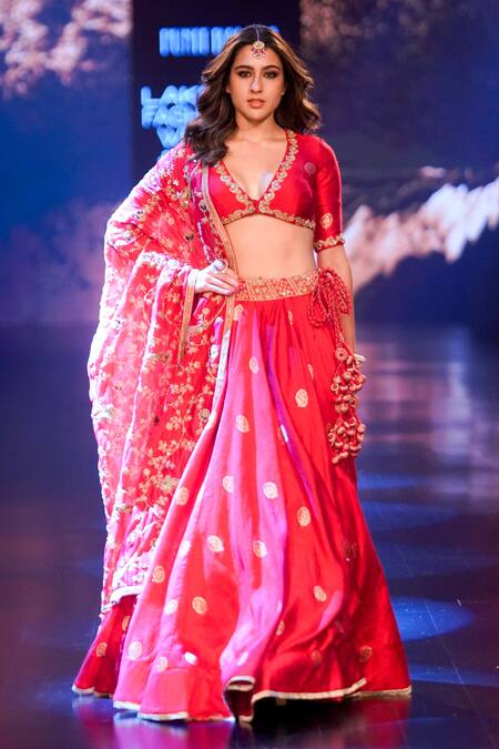 Red Banarasi silk lehenga featuring floral motifs and marodi embroidery. Paired with an embroidered blouse and paisley jaal embroidered dupatta.