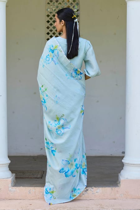 Soft blue saree featuring magnolia floral hand painting and contrast stripe border with hemming detail