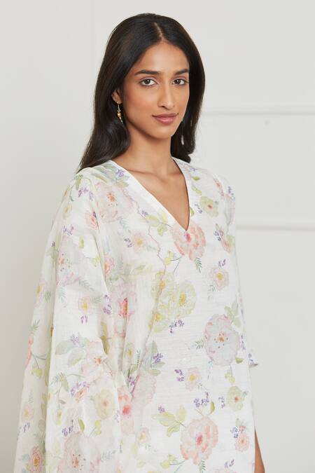 Ivory Handloom Cotton V-neck Bliss Botanical Print Kurta And Pant Set