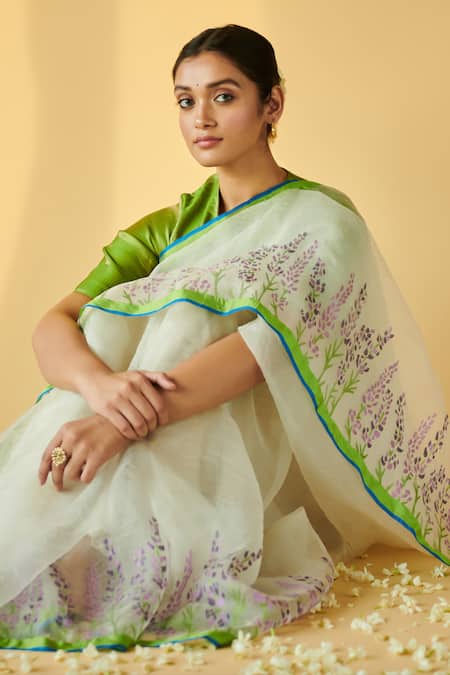 White saree crafted from handwoven organza silk featuring blooming, field border woven motifs