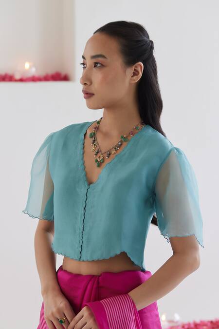 Blue Silk Embroidery Fleeting Moments Scallop Border Blouse