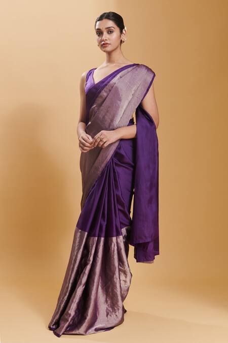 Purple handwoven silk satin saree featuring a metallic broad border and gold hem details