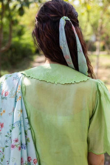 Spring green saree blouse in handwoven organza mulberry silk featuring a scalloped neckline and floral embroidery. Comes with a separate inner slip.