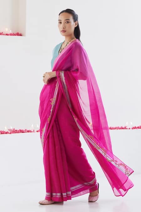 Deep pink saree crafted from handwoven organza mulberry silk featuring floral jamdani patterns and a striped border