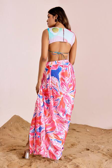 Multi color bralette featuring abstract prints, V neck, and back hook closure. Paired with a draped skirt with slit detailing and abstract prints.