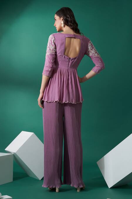 Lilac crop top with side drapes, embroidered in white & light gold floral motifs. Paired with pleated pant.