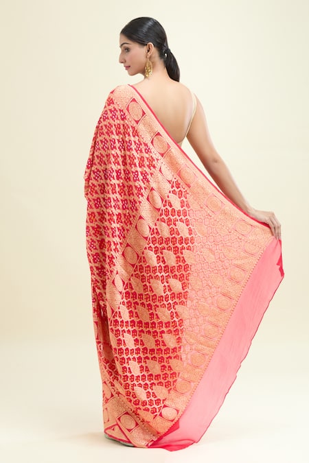 Red saree featuring a bandhani Banarasi woven pattern. Paired with a matching unstitched blouse piece.