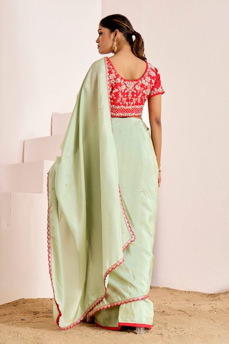 Green shimmer saree featuring floral buttis and sequins embroidered scallop contrast red border. Paired with a contrast red sequin-bead embroidered floral padded blouse.