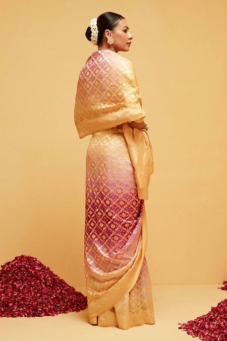 Magenta and yellow ombre saree featuring bandhani and floral banarasi woven motifs in a checkered pattern. Comes with a running blouse piece.