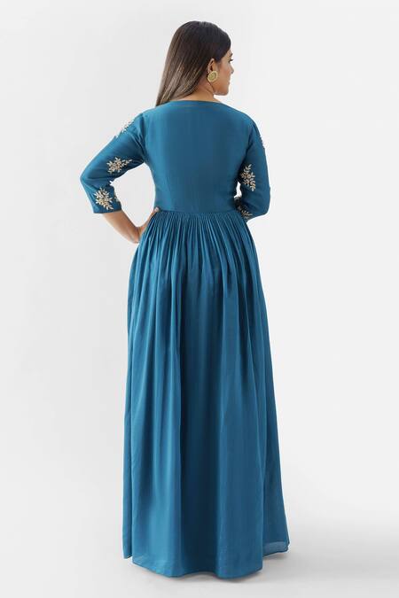 Peacock blue Angarkha in cotton silk base fabric handcrafted in zardozi floral motifs & side tassel tie-up.