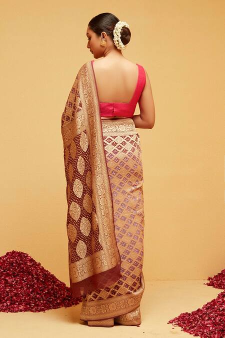 Brown saree featuring bandhani and diamond banarasi woven motifs in a checkered pattern. Comes with a running blouse piece.