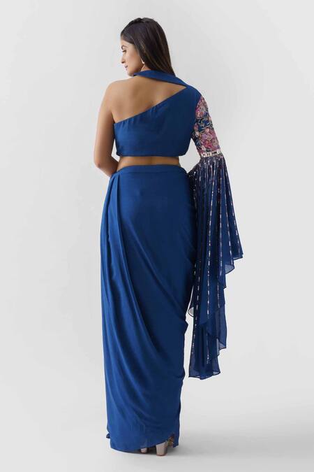 Royal blue pleated draped skirt. Paired with one shoulder crop top with bell sleeve, embroidered in mirror work , floral and geometrical motifs.