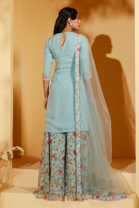 Light blue georgette crepe kurta featuring floral and sequins embroidery with a round neckline and three-quarter sleeves. Paired with a matching sharara and dupatta.