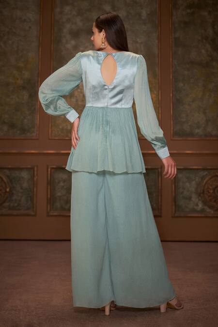 Sea green peplum top with hand embroidered yoke. Comes with flared pant.