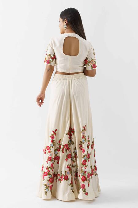 Off-white flared palazzo in tussar silk base fabric with thread work embroidery details in contrasting colors. Paired with crop top with crew neckline, back cut-out and embroidery on one shoulder.