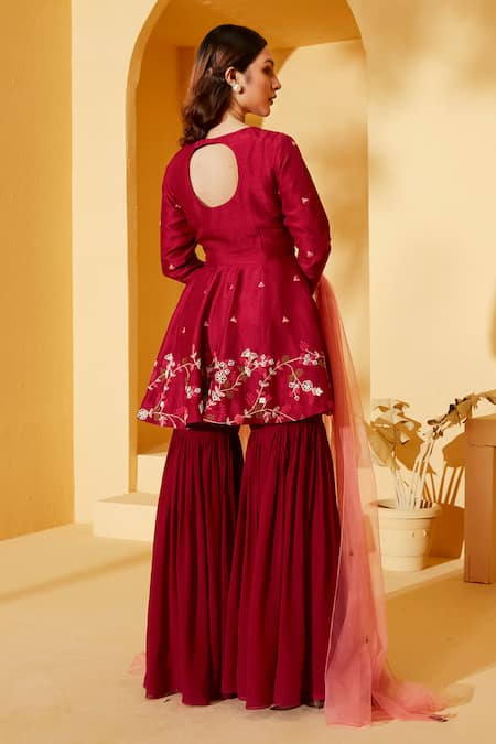 Wine georgette and tussar silk padded short anarkali featuring floral, thread, and mirror embroidery. Paired with a sharara and a net dupatta.