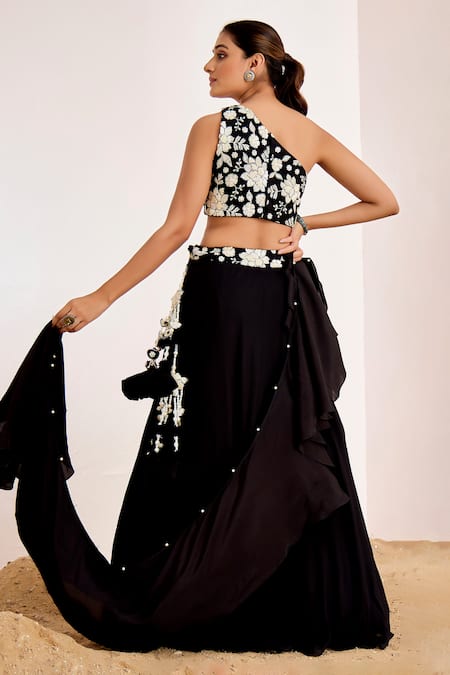 Black lehenga set featuring a floral sequin embroidered one-shoulder blouse. Paired with a lehenga that has an embroidered waistband and a ruffled dupatta.
