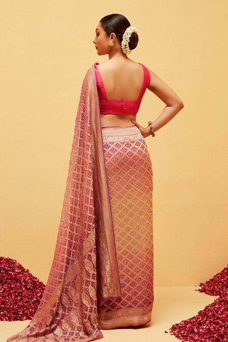 Pink saree featuring bandhani and floral banarasi woven motifs in a geometric pattern. Comes with a running blouse piece.