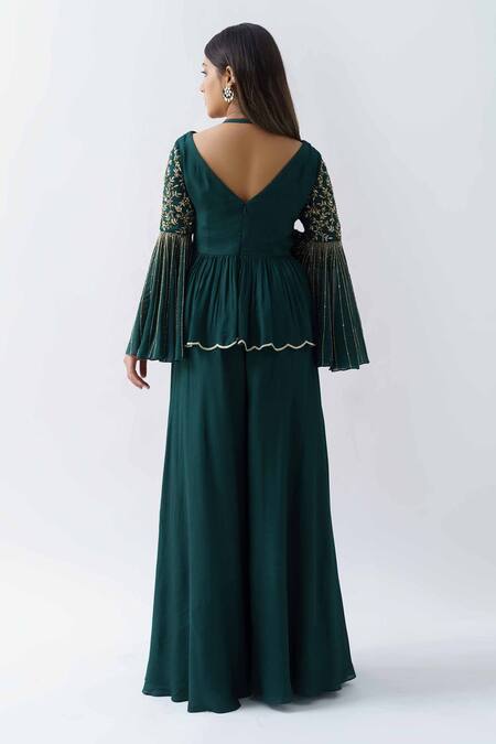 Bottle green peplum style tunic with embellished yoke and bell sleeves. Comes with flared pants.