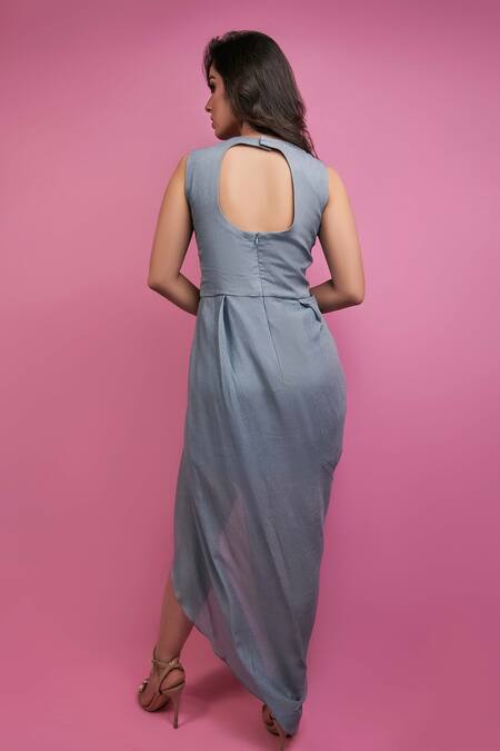 Grey long jacket with embellishment and ruffle detail at the hems. Comes with draped dress.