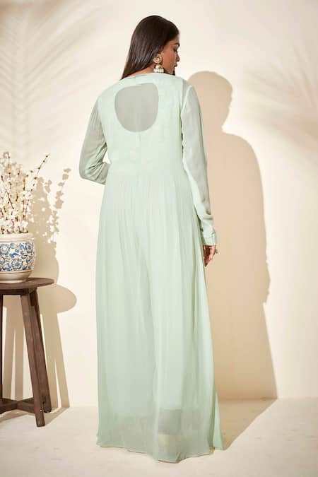 Sea green dhoti style jumpsuit with thread embroidery. Comes with long jacket.