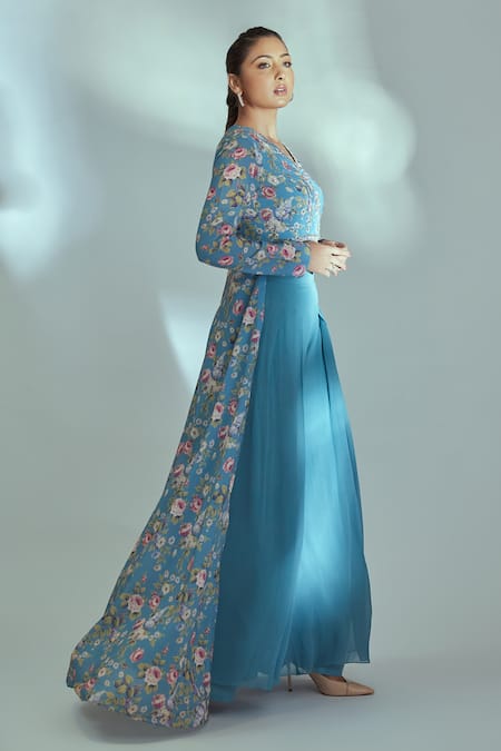 Blue crop top with floral patterns, intricately hand embroidered highlights & back gown style long flare. Comes with flared pant.