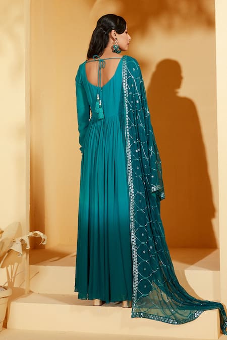 Teal green anarkali featuring a V neck, full sleeves, and back zip & tie-up closure. Paired with a sequins embroidered dupatta and attached lining.