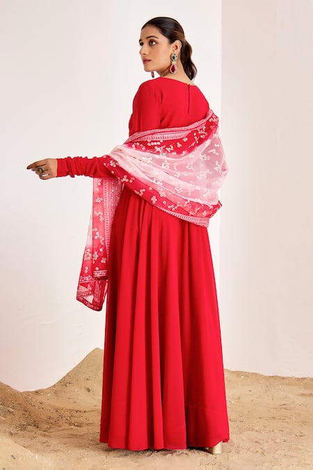 Red anarkali featuring churidar sleeves and a sweetheart neckline. Paired with a floral embroidered dupatta adorned with thread, sequin, and bead work.