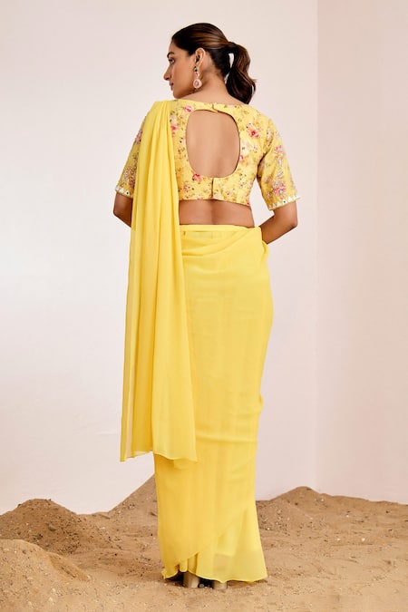 Yellow pre-draped saree in georgette crepe with attached lining. Paired with a floral printed padded blouse featuring sequin embellishments and a cut-out back.