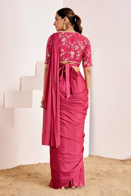 Pink pre-draped saree paired with a floral sequin embroidered wrap padded blouse. Features a V-neckline, three-quarter sleeves, and metallic lace detailing on the blouse.