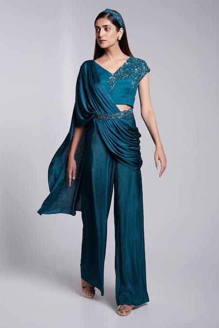 Teal green embroidered top featuring a V neck, half sleeves, and padded design. Paired with pleated pants and an embroidered belt for an elegant look.