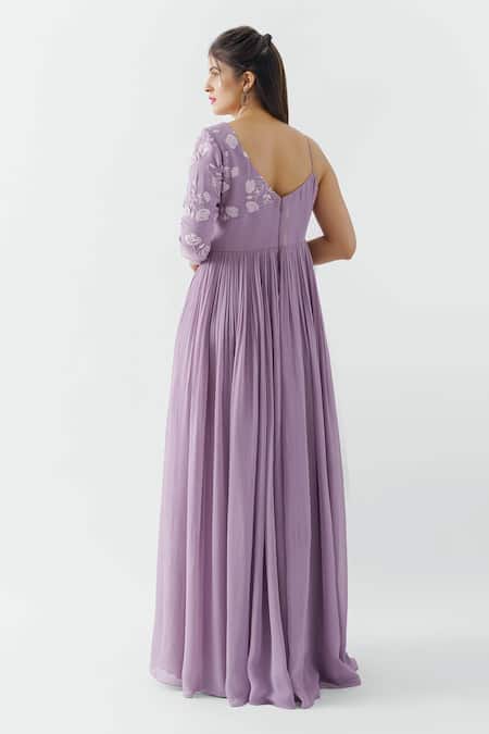 Mauve gown in georgette base fabric with pleated yoke, thread and sequin embroidery, asymmetric neckline with full sleeve on one arm and sleeveless on the other.
