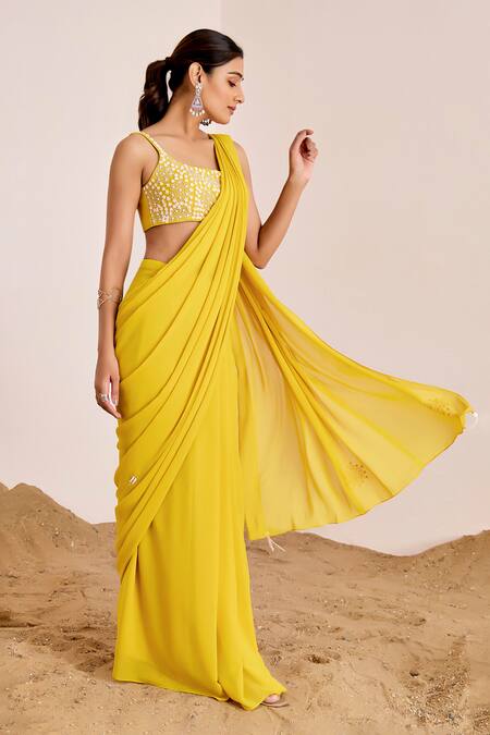 Yellow pre-draped saree featuring a pleated pallu. Paired with a zardozi and thread embroidered padded blouse.