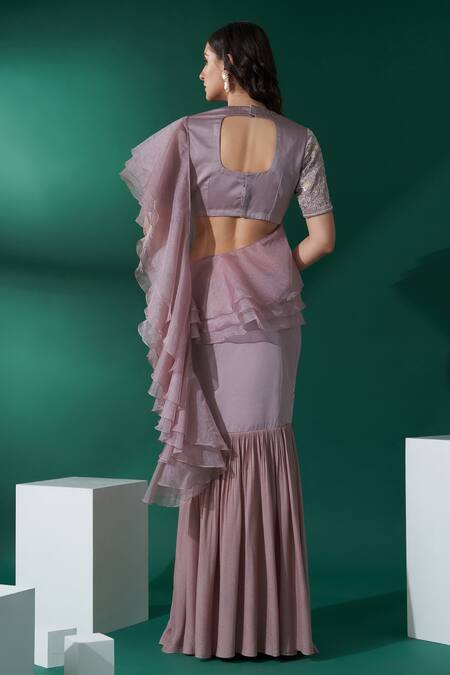 Buy_Suruchi Parakh_Beige Organza, Satin, Georgette Crepe Pre-draped Ruffle Saree With Blouse_Online_at_Aza_Fashions