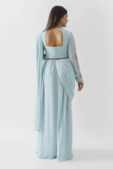 Light blue pre-draped saree with pleated palla. Paired with blouse with embroidered in floral & geometrical motifs & vertically panelled sleeves.