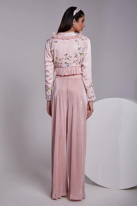 Pink Crepe, Satin, Silk Embroidery V-neck Ruffle Short Jacket And Pant Set