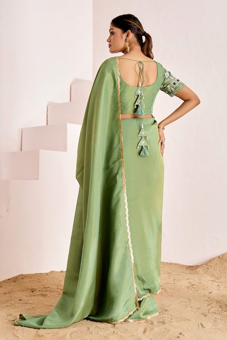 Green shimmer saree featuring a scallop sequin border. Paired with a floral embroidered padded blouse adorned with sequins and beads, showcasing a cutwork neckline and a back tie-up detail.