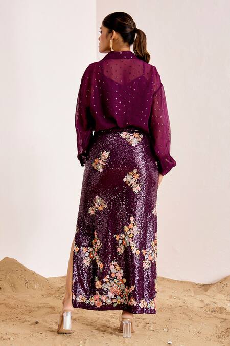 Purple sheer shirt with floral sequin butti embellishments. Paired with a skirt featuring all-over sequin embroidery and a side slit.
