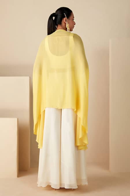 White bustier featuring butti details paired with a yellow cape adorned with multicolored thread and bead floral embroidery. Complemented by flared pants for a complete look.