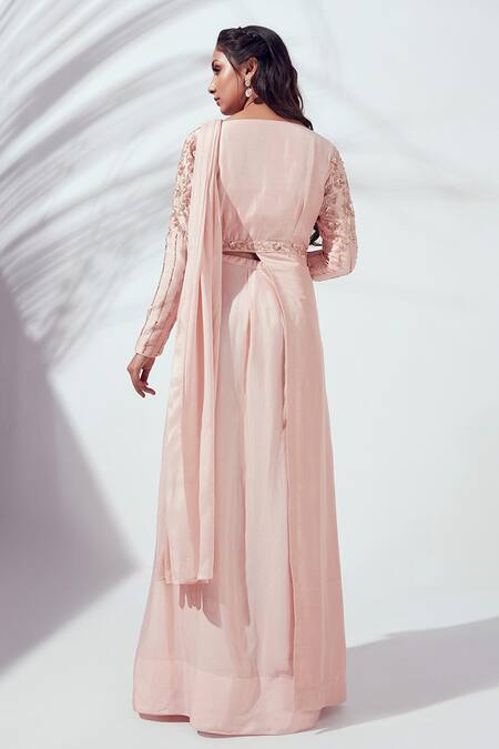 Pink pre-draped saree with attached pallu and asymmetrical hem. Comes with embellished jacket style blouse.