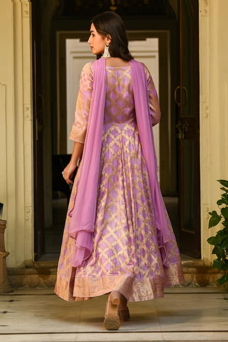 Buy_Suti Kapda_Purple Silk, Chiffon Round Neck Banarasi Woven Anarkali Pant Set _at_Aza_Fashions