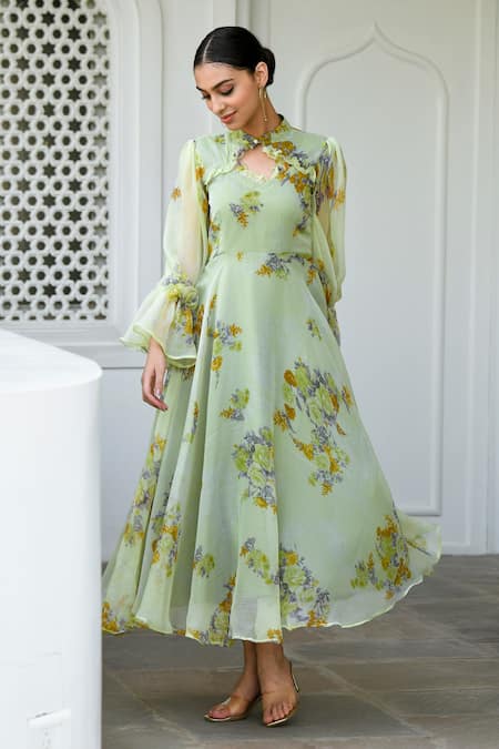 Green chiffon dress featuring a floral bouquet print with neck ruffles