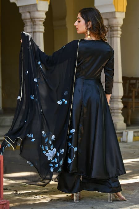 Black Satin Embroidery, Gota Patti Round Neck Floral Print Anarkali Pant Set
