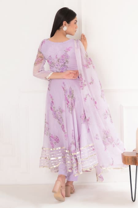 Purple floral printed anarkali featuring three-quarter sleeves and a round neckline. Paired with matching pant and dupatta with gota detailing.
