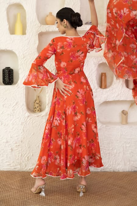 Orange angarkha anarkali featuring printed floral blossom patterns and scalloped lace embellishment. Paired with an attached dupatta for a complete look.