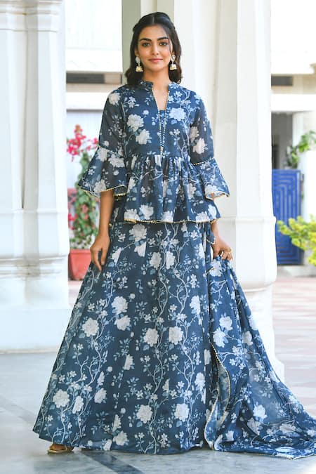 Buy_Suti Kapda_Blue Chanderi Lace, Embroidery Mandarin Collar Floral Vine Print Lehenga Set