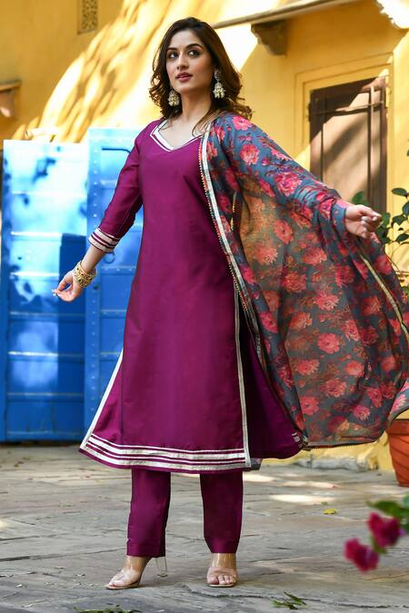 Purple straight kurta featuring lace borders and a V-neckline. Paired with matching pants and a floral print dupatta.