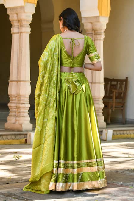 Green lehenga featuring lace borders and a panelled design. Paired with a matching blouse and bandhej dupatta.