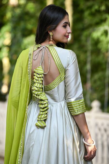 Buy_Suti Kapda_Beige Taffeta, Chiffon Lace Scoop Embellished Colourblock Anarkali With Dupatta_Online_at_Aza_Fashions
