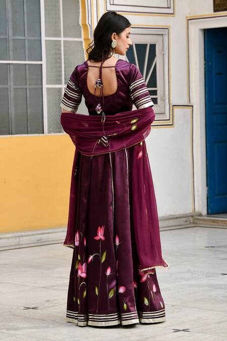 Buy_Suti Kapda_Purple Silk, Satin Gota Patti Polo Lotus Floral Bloom Print Lehenga And Blouse Set_at_Aza_Fashions